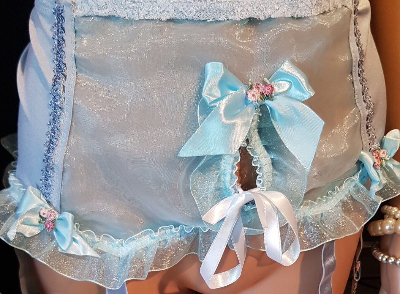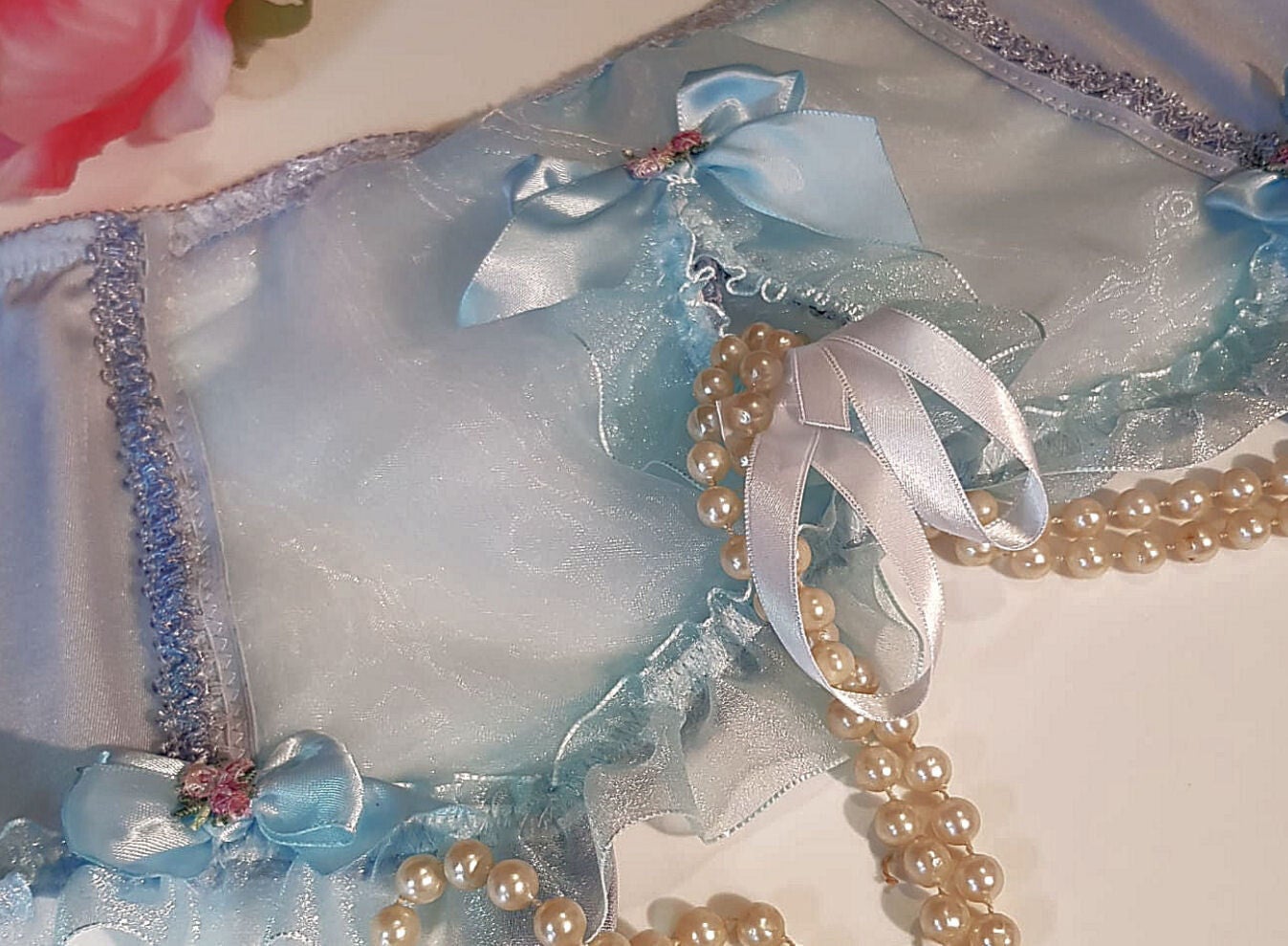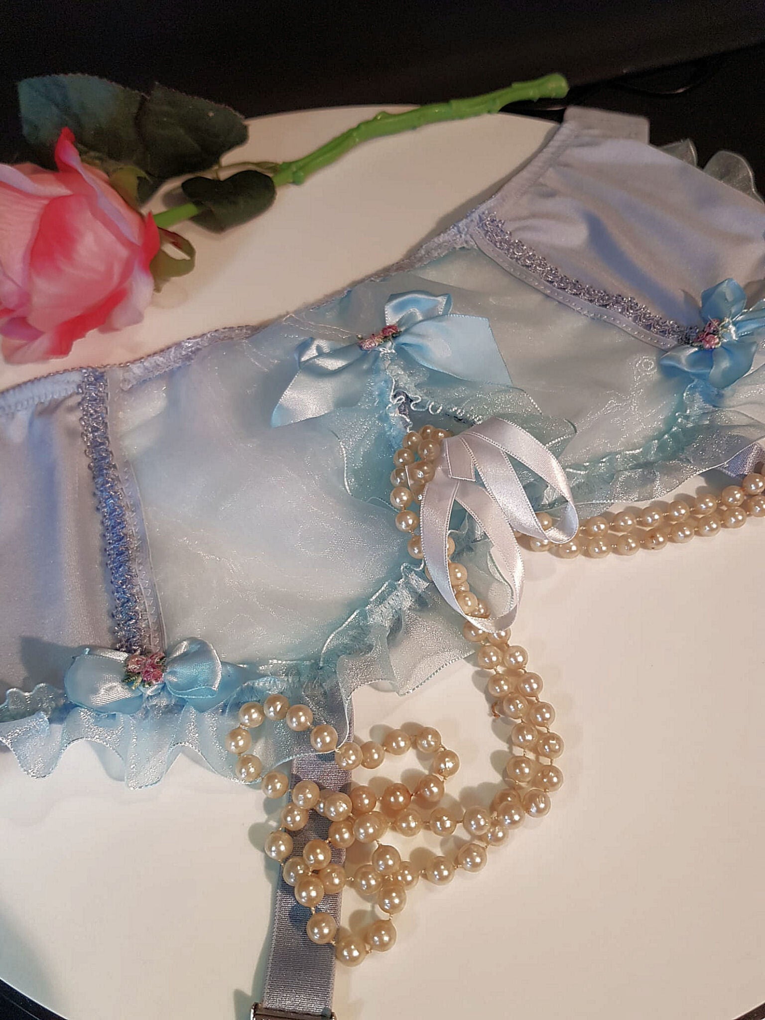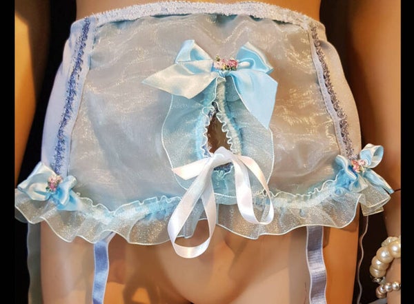 Adult Sissy 6 Strap Blue - White Garter belt - Shiny Organza Spandex & LACE - Adjustable Hook n Eye back closure,