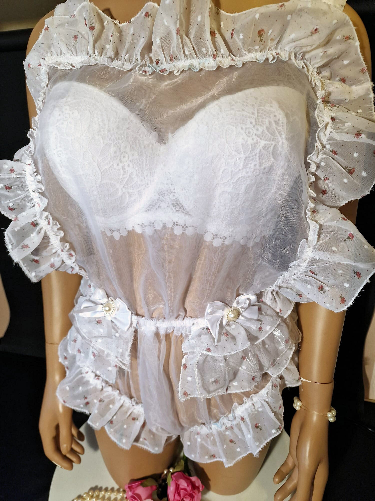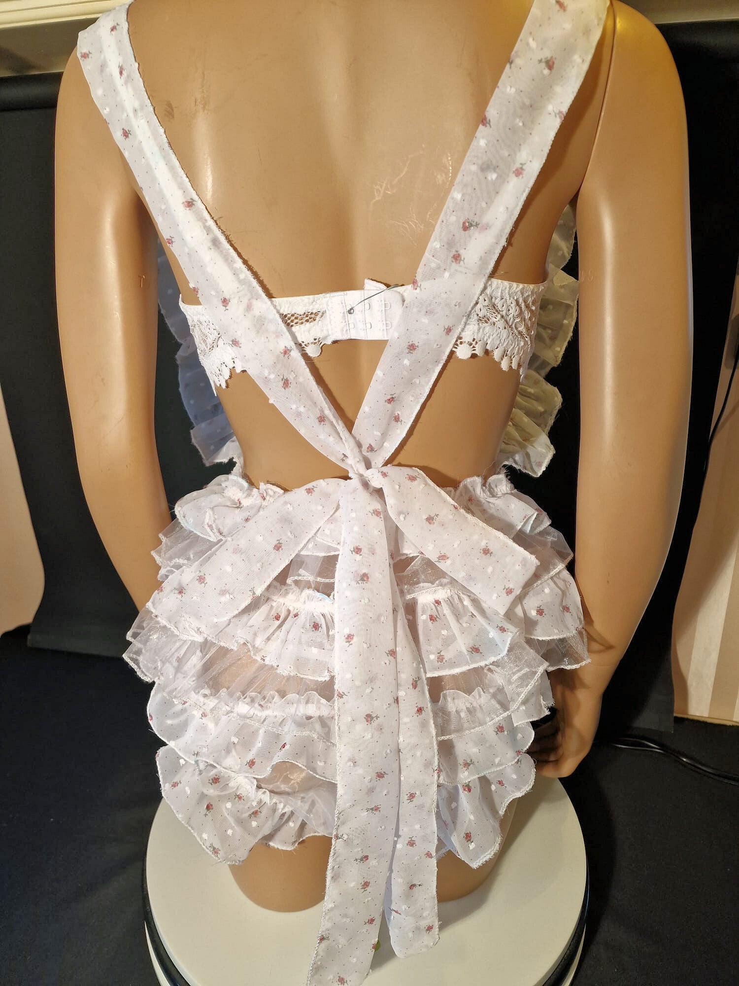 The romper fastens with a rose ribbon that ties beautifully at the back with a bow on the buttocks. The front is finished with satin bows.