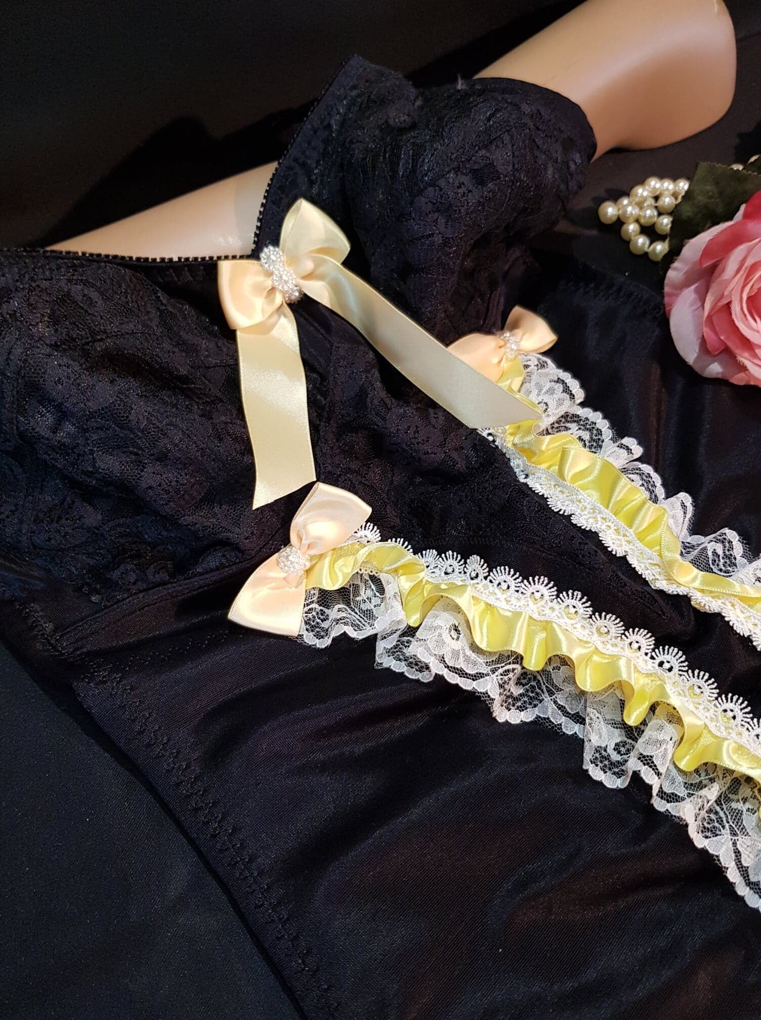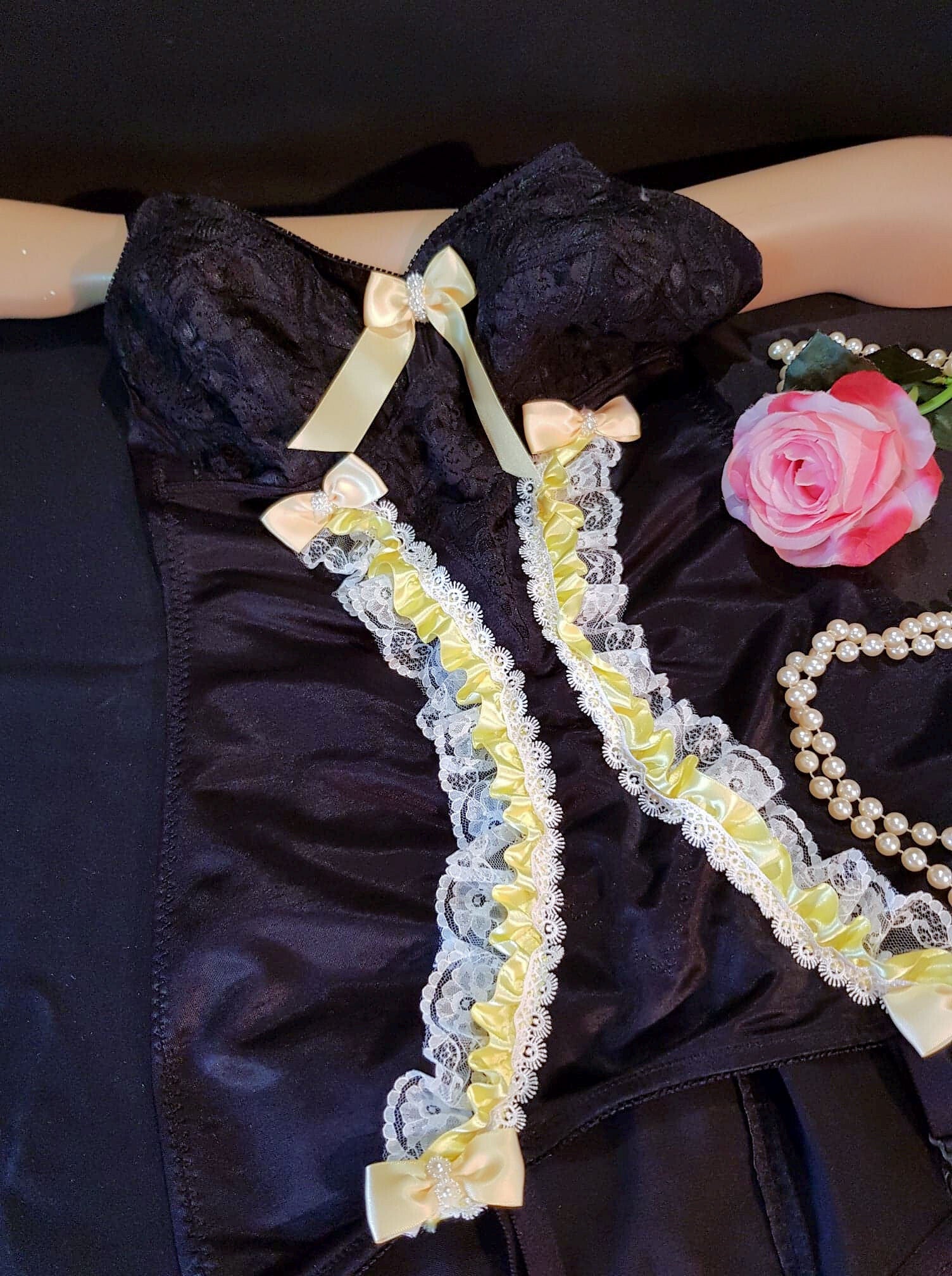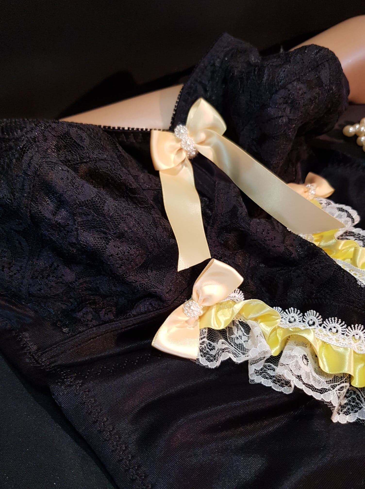 Afgewerkt met prachtig geel satijn met een laagje wit hoogglanzend kant en gebloemd kant.